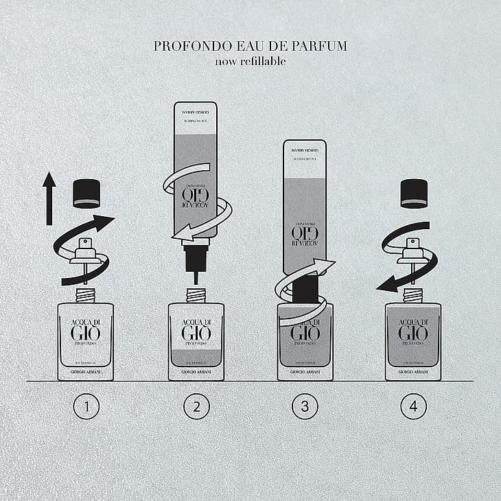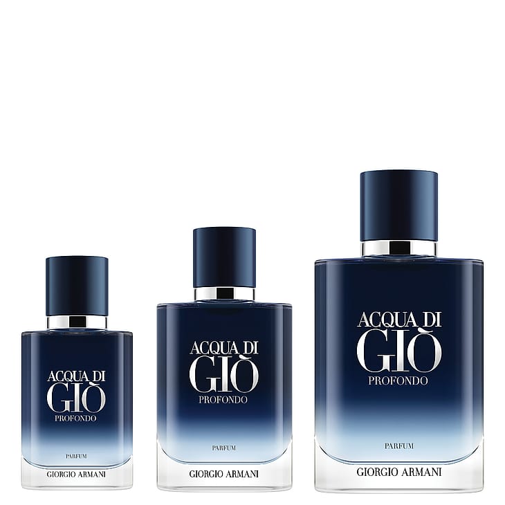 Den nye ACQUA DI GIÒ PROFONDO PARFUM fanger den vanedannende og intense tiltrekningen til havets ukjente dybder. Duften formidler en følelse av dyp friskhet og opplevelsen av å omgi seg med havets mysterier. Flaskens spennende innhold fremkaller en tett, harpiksaktig og mineralsk fasett av ACQUA DI GIO. Disse notene er laget rundt bergamottnoter, balsamisk cistus-absolutt og rikheten av evigvarende essens, og gir ACQUA DI GIÒ PROFONDO PARFUM sin dybde og intensitet. Duften minner om havets uendelighet og presenteres i en dypblå flaske, med en tone som går fra dyp blå øverst til gjennomsiktig turkis nederst. Flasken er designet med en elegant metallisk blå kork, med en sølvfarget aksent under.