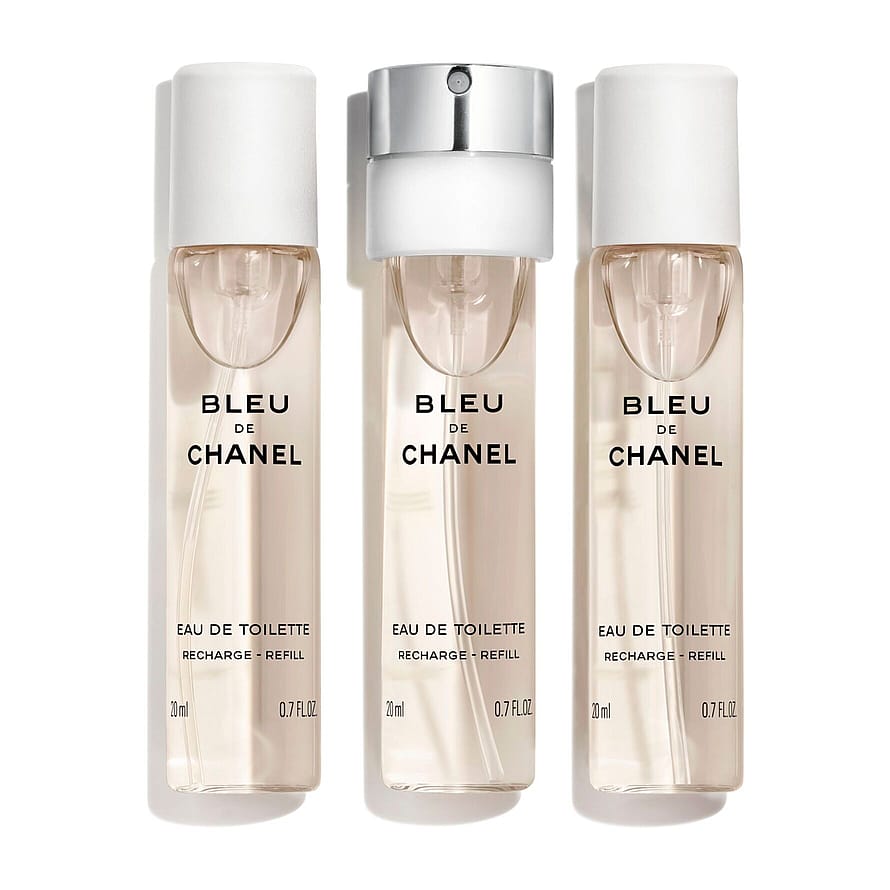 BLEU DE CHANEL Eau de Toilette. En aromatisk, treaktig duft som etterlater et fascinerende duftspor. Twist and Spray utgaven er et praktisk og utrolig reisevennlig format med en 20 ml refill som du kan ha med overalt. Den innovative designen med diskret minimalistisk stil og dyp, mystisk blåtone gjør flakongen til et attraktivt objekt. Vri én gang, og BLEU DE CHANEL Eau de Toilettes aromatiske og treaktige noter frigjøres og eksponerer sin varme og sensuelle karakter.