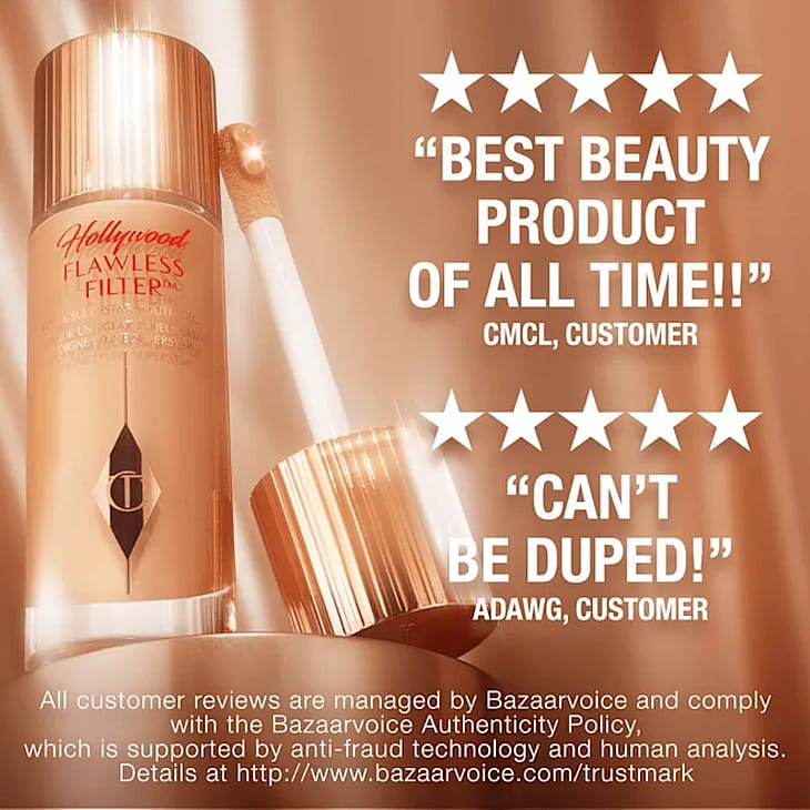 Få en stjerneglanset hud på få sekunder med Charlotte Tilbury Hollywood Flawless Filter. Den mykgjørende effekten av din favorittprimer, gløden fra en highlighter og dekningen fra et digitalt filter hjelper til å glatte, lyse opp og jevne ut hudens utseende på få sekunder. Bruk den sammen med ditt favorittbaisprodukt eller bruk den under, over eller i stedet for foundation.