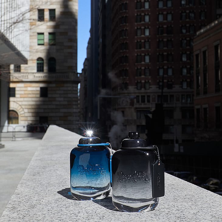 Flasken er lakkert i en gradering fra dyp og intens til en lys og friskere blåfarge, med en sølvfarget vrilås. Den har mange referanser til de ikoniske Coach-kodene: spraylokk med vrilås, hengeetikett i imitert skinn og graveringen av Horse & Carriage-logoen. For å matche flasken har den skinnstrukturerte emballasjen blitt omarbeidet med en gradering fra svartblå til lysere blå.