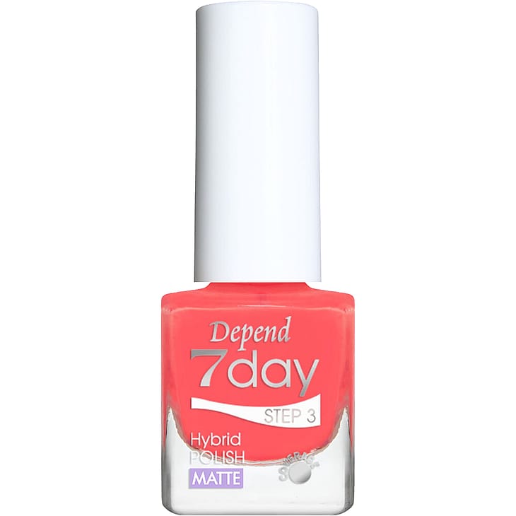 Cool, Fun, Sassy, Bright, Happy - Depend 7day er lakksystemet for deg som er ute etter en neglelakk med superglans, lang holdbarhet og "gel-følelse". Denne hybridformelen holder i opptil en uke, er enkel å påføre og du kan enkelt fjerne lakken med Depend neglelakkfjerner. Du behøver ingen LED-/UV-lampe ettersom lakksystemet tørker i normalt dags-/lampelys. Vegansk formel, inneholder ikke råvarer av animalsk opprinnelse.