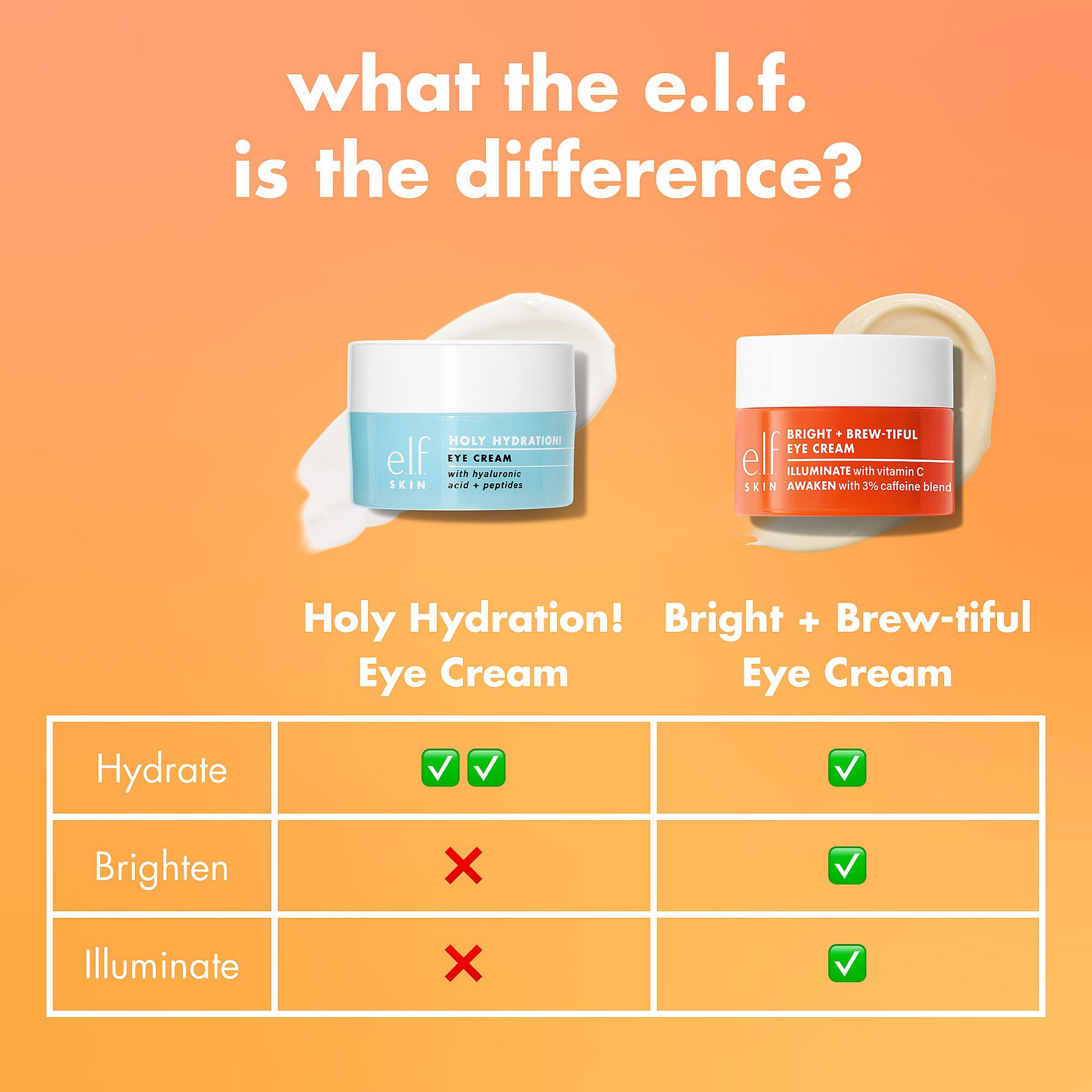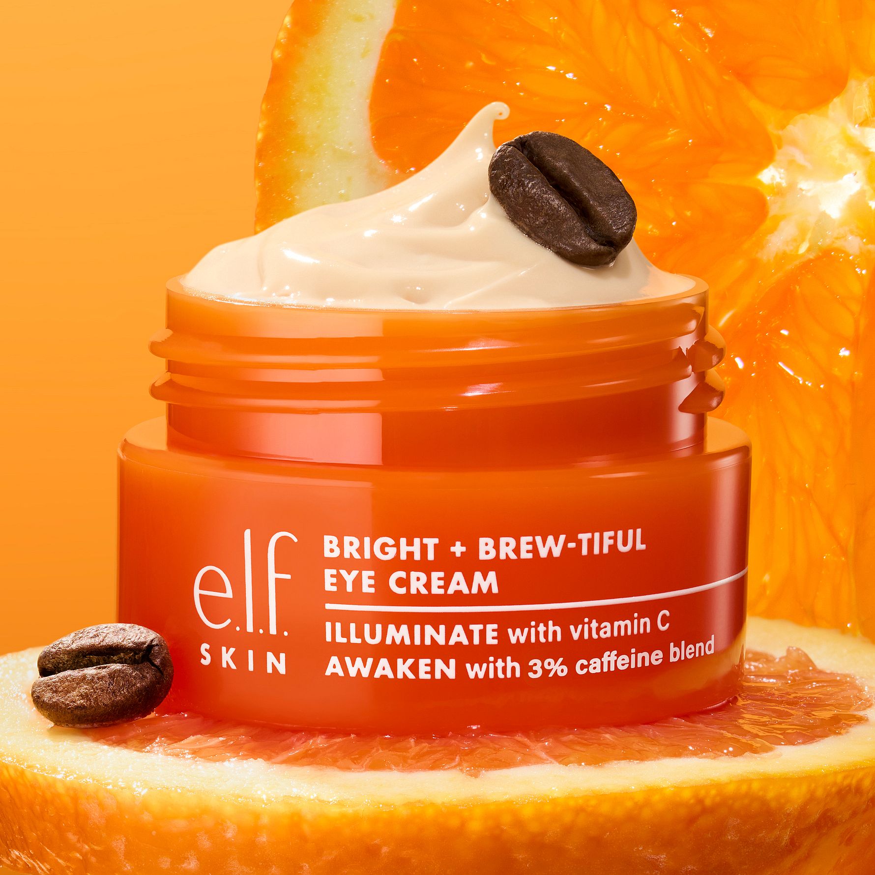 Wake the e.l.f. up med SKIN Bright + Brew-tiful Eye Cream – en lysnende øyekrem som gir et uthvilt og friskt blikk. Med vitamin C som synlig lysner mørke ringer, et bananfarget pudder for umiddelbar glød, og en 3 % koffeinblanding som reduserer hevelser, fungerer denne som en liten shot med «eye-spresso» når huden trenger en boost. Den lette, avkjølende formelen trekker raskt inn i huden og legger seg sømløst under concealer – så det ser ut som du har fått åtte timers søvn (selv om du ikke har det).
