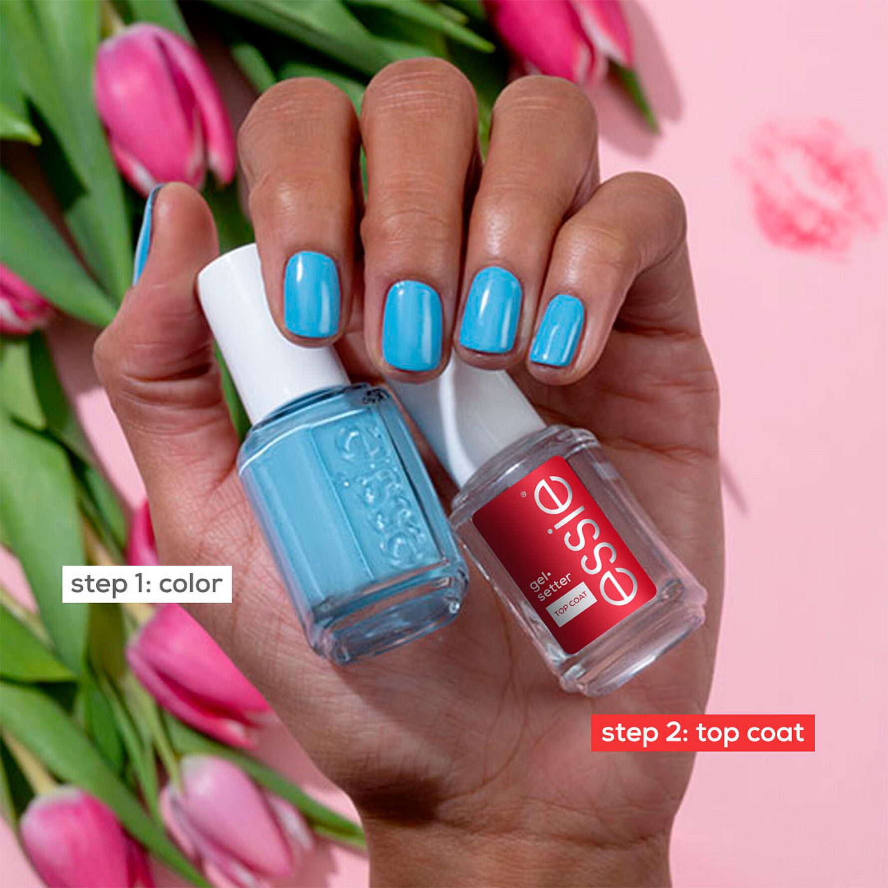 Trin 3: Påfør 1 lag essie top coat for at beskytte farven og give glans. Prøv stay longer for salonlignende kvalitet i op til 7 dage*, gel setter for gel-lignende farve og glans, eller speed setter for en hurtigere tørretid.