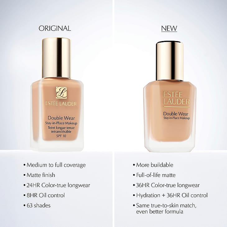 Denne foundationen gir en vakker og naturlig finish, jevner ut hudtonen, skjuler urenheter og har en byggbar medium til full dekning. Finnes i 60 globalt med kalde, nøytrale og varme undertoner. Double Wear Foundation er vannfast, slik at den ikke endrer farge, ikke gnis utover og ikke setter merker på klær. Den gir huden rikelig med fukt og farge som holder i hele 24 timer – uansett stress og aktivitetsnivå.