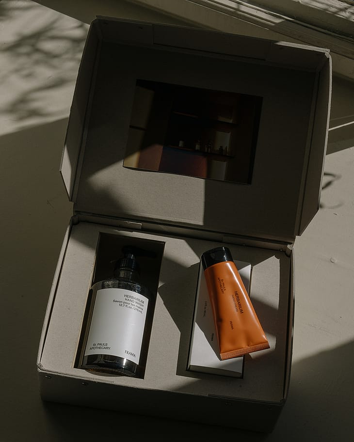 Enten du ønsker å glede en du er glad i eller overraske en venn med en gjennomtenkt gave, vil FRAMAs gavesett garantert falle i smak. Dette settet inneholder to av kolleksjonens signaturprodukter, Herbarium Hand Wash og Hand Cream, og holder huden din sunn og myk, samtidig som det sprer en behagelig duft med aromatiske noter av appelsin, einer, rose og ho-tre.