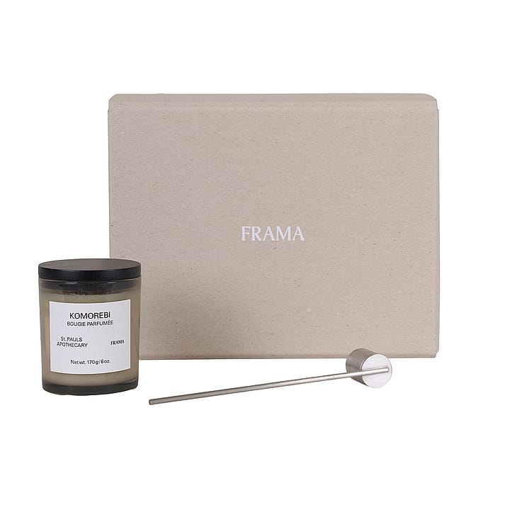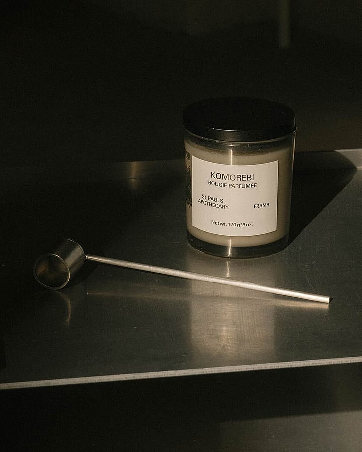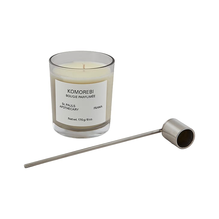 Et duosett som skaper stemning i ethvert rom. Komorebi Scented Candle er inspirert av det japanske begrepet om lys som strømmer gjennom, og fanger sansene med sine delikate noter. Lyseslukkeren er derimot en praktisk, moderne tolkning av det klassiske verktøyet, laget av delikat, men holdbart rustfritt stål. Slukkeren vil utvikle seg over tid og få en elegant patina.