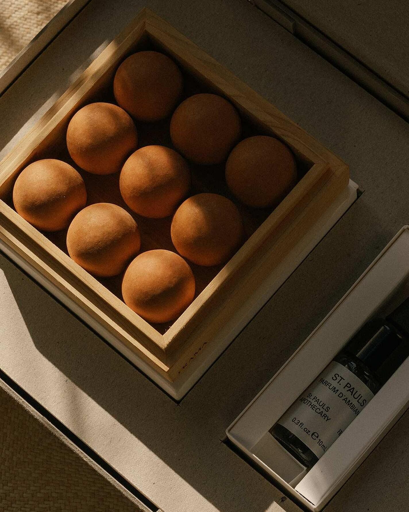 St. Pauls From Soil to Form er en stemningsfull måte å dufte opp rommene dine på, med en lukt knyttet til våre minner og varmen fra våre opplevelser. Åpne trekassen forsiktig og påfør maksimalt fem dråper jevnt over kulene for å frigjøre duften. Etterfyll ved behov med St. Pauls Essential Oil Dropper 10 mL.