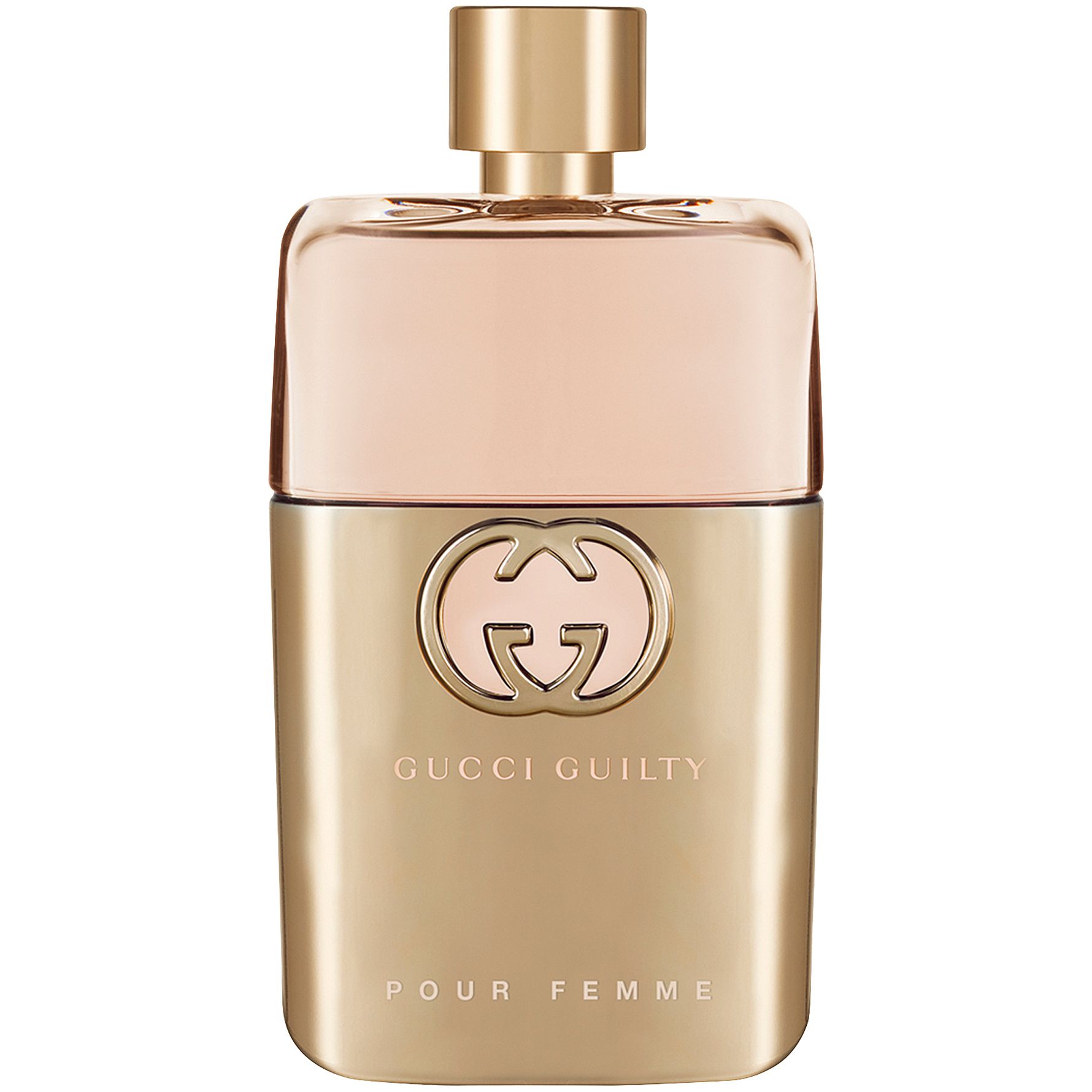 Gucci Guilty Pour Femme Eau de Parfum er en sofistikert duft som uttrykker lidenskap, selvsikkerhet og moderne femininitet. Duften åpner med friske og strålende noter av mandora, bergamott og krydret rosépepper. I hjertet blomstrer syrin sammen med nyanser av rose, fiol og geraniumolje, noe som skaper et komplekst og mangesidig blomsteruttrykk. Basen avrundes med patchouli og ambernoter som gir varme, dybde og en forførende intensitet. Flasken, som speiler den ikoniske herreduften i samme kolleksjon, er delvis kledd i gullfarget metall og avsluttes med en elegant matt gullkork – en sofistikert ramme rundt den rosétonede væsken inni.