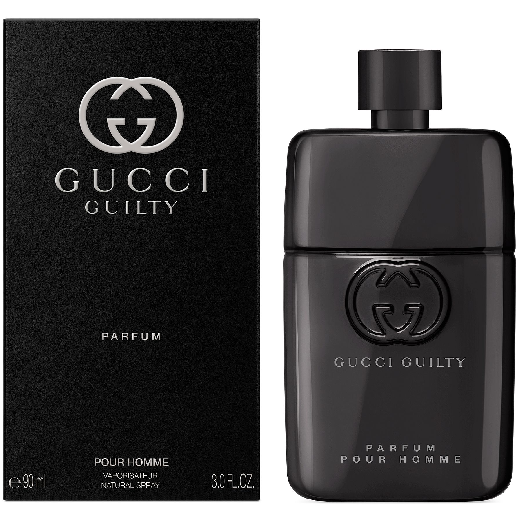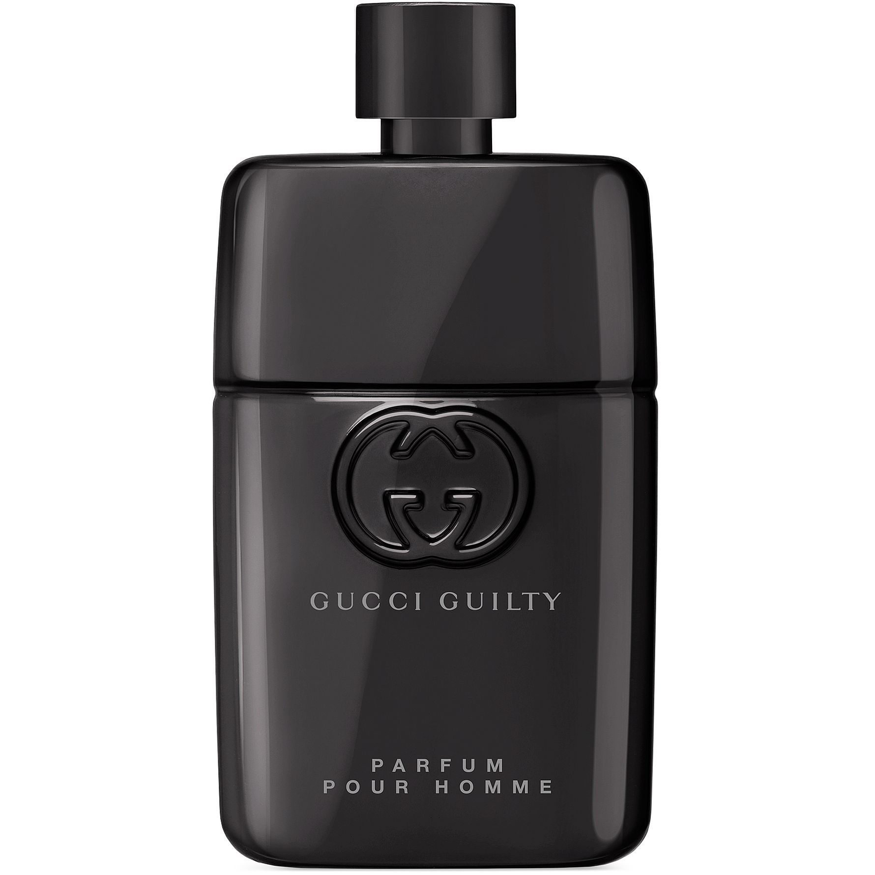 Gucci Guilty Pour Homme Parfum er en intens og moderne tolkning av maskulinitet, der trenoter og aromatiske noter forenes i en sofistikert komposisjon. Duften balanserer eleganse med styrke og er skapt for menn som ønsker å uttrykke selvsikkerhet og autentisitet. Den åpner med fransk lavandin og frisk sitron, blandet med einebær for en oppkvikkende krydderhet. I hjertet finnes cistus med sin dype amberkarakter, kombinert med appelsinblomst og krydret muskatnøtt. Basen avrundes med patchouli, hvis intensitet forsterkes av trenoter og sensuelle noter av musk. Flasken i mørk antrasitt med det ikoniske GG-emblemet speiler duftens mystiske eleganse og dype karakter.