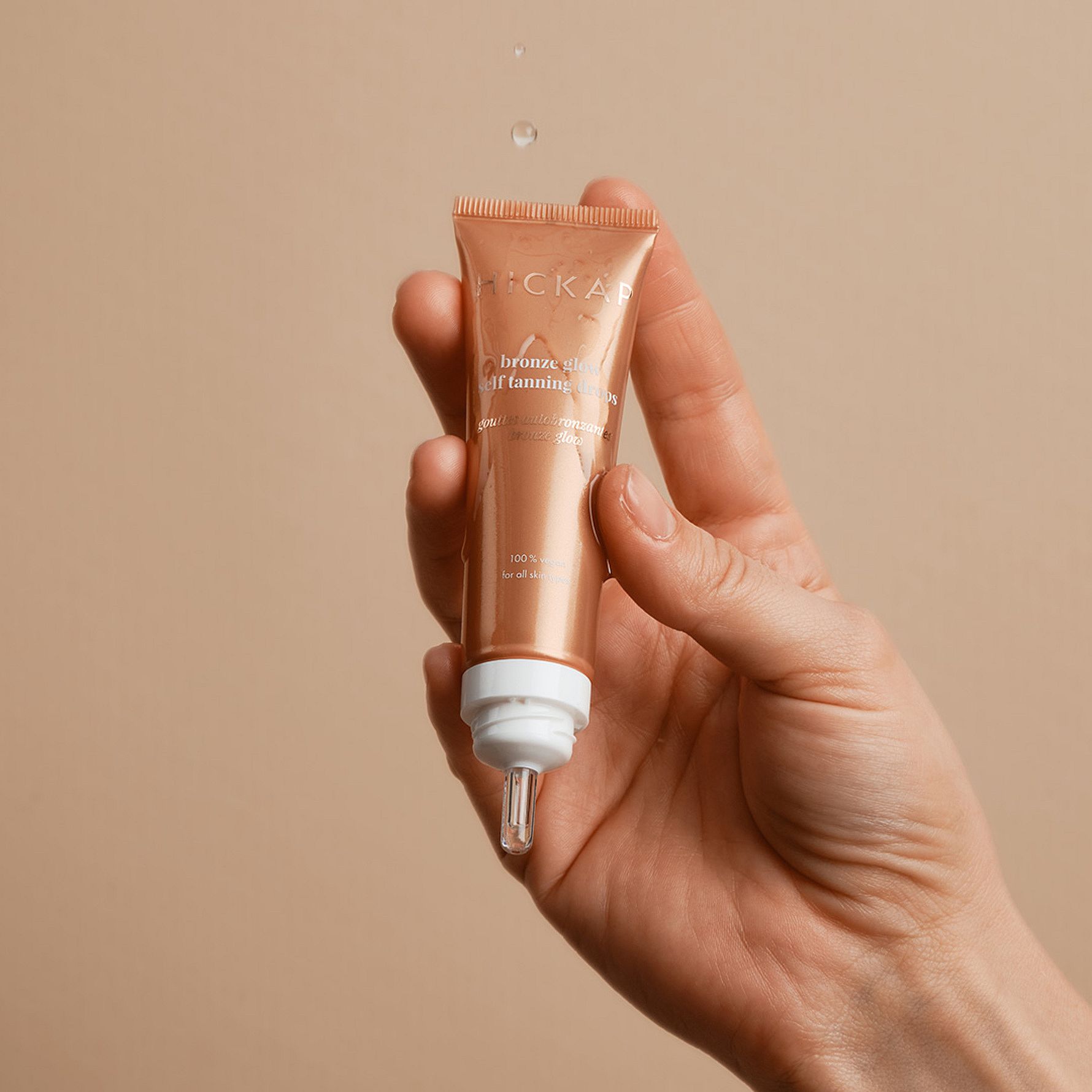 Hickap Bronze Glow Self Tanning Drops er konsentrerte selvbruningdråper som kan blandes med et hvilket som helst hudpleieprodukt for å skape en naturlig solkysset hudtone. Dråpene er enkle å bruke, gir et jevnt resultat og inneholder panthenol som fukter og beroliger huden.