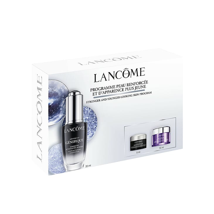 Lancôme Advanced Génifique hudpleiesett er for deg som ønsker å forbedre din hudkvalitet. Advanced Génifique serum er det første steget mot vakker hud. Serumet optimaliserer hudpleierutinen og styrker hudens ungdommelige utseende. Advanced Génifique er et styrkende og fuktighetsgivende serum som fremmer glød i huden. Patentert formel med pre- og probiotiske ekstrakter som balanserer hudens mikrobiom: Et sterkt mikrobiom er nøkkelen til en sterk hudbarriere, og dermed til en fin og ungdommelig hudkvalitet. Settet er et startsett for å komme i gang med hudpleierutinen og inneholder: Génifique Serum 20ml, Génifique Øyekrem, Rénergie Multi-Lift Ultra 15ml.