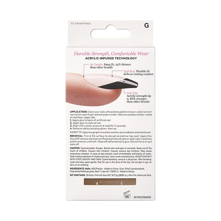 Rengjør neglene med neglelakkfjerner og vask hendene grundig med såpe. Velg riktig størrelse spiker for hver finger og sett til side i rekkefølge. Påfør lim på baksiden av den kunstige neglen. Påfør lim på naturlige negler. fest med neglebåndet, trykk forsiktig og hold i 5 sekunder. Eksperttips: Påfør nok lim for å unngå luftlommer, sikre vedheft og forlenge slitasje. FJERNING: Trim og fil overflaten. Bruk KISS Glue OFF, eller bløtlegg neglene i aceton neglelakkfjerner til de er myke. Tørk av neglen og limet. Ikke tving eller trekk neglene bort.