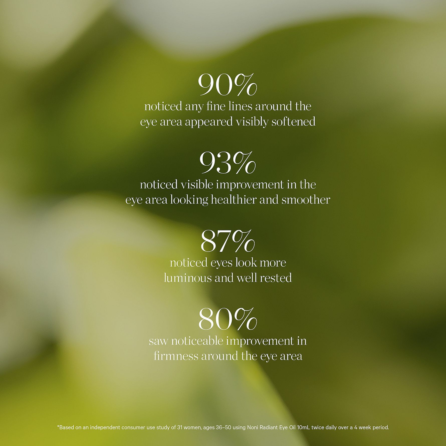 * Basert på en uavhengig forbrukerstudie med 31 kvinner i alderen 36-50 år som brukte Noni Radiant Eye Oil 10 ml to ganger daglig over en periode på 4 uker.