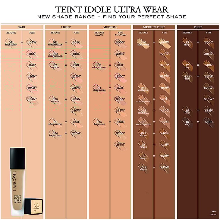 Foundation er tilgjengelig i 50 nyanser, utviklet med en innovativ nyanseserie, bygget med oksidgrønne og ultramarine blå pigmenter for økt nøyaktighet hos middels og dype nyanser, som sikrer deg din perfekte Teint Idole-match.