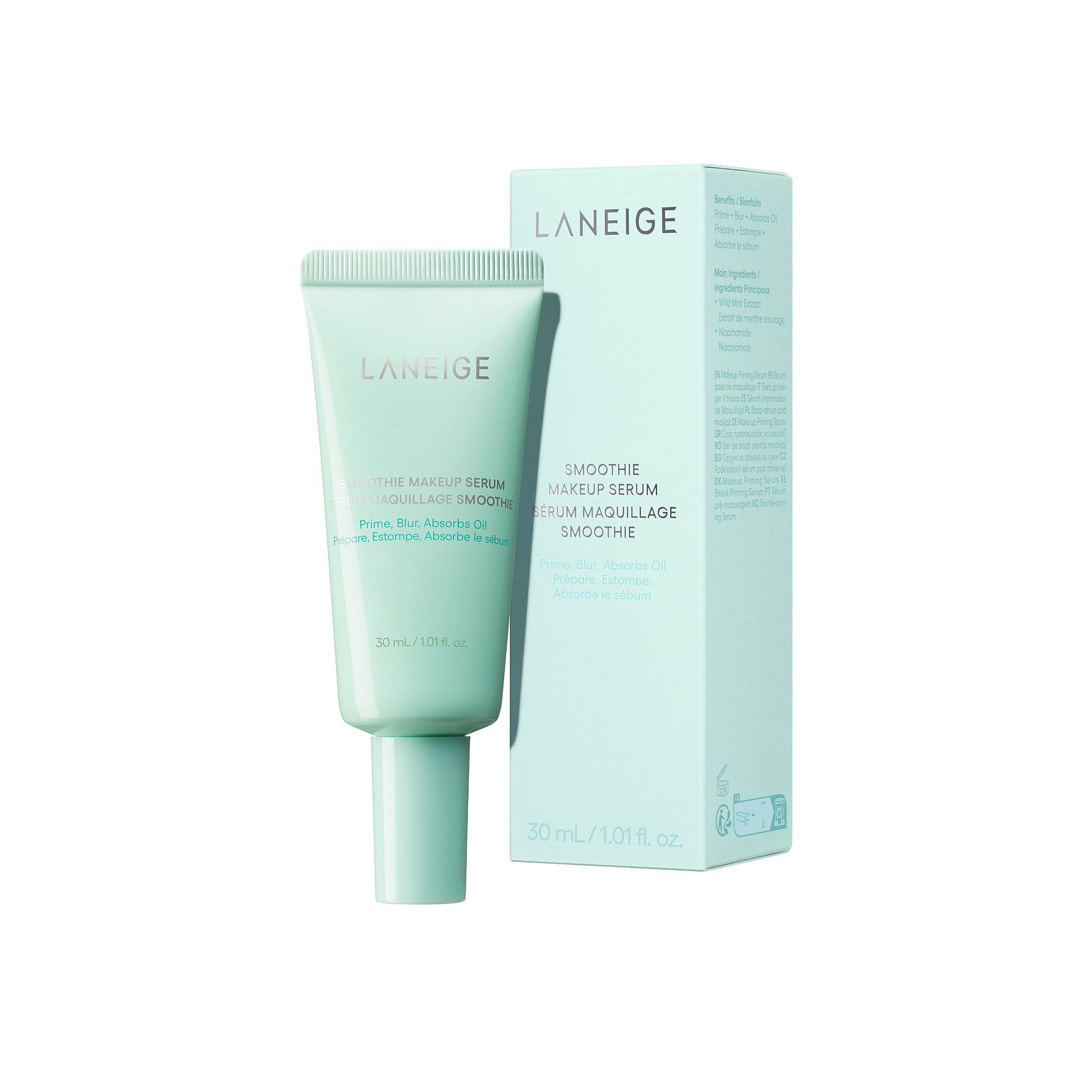 LANEIGE Smoothie Makeup Serum er et lett, silikonfritt primer-serum utviklet spesielt for fet og kombinasjonshud. Den kraftfulle formelen er beriket med ceramid, niacinamid og betaglukan, som gir fukt og bidrar til å forbedre hudteksturen over tid. Oljekontrollerende mintblarekstrakt reduserer glans, samtidig som huden holdes behagelig fuktet gjennom dagen.