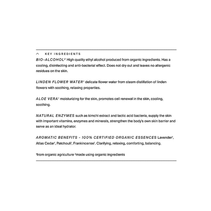 Angustifolia Oil1, Pogostemon Cablin Leaf Oil1, Boswellia Carterii Oil1, Parfum1 (100 % organic essential oils incl. Limonene, Linalool, Geraniol, Citral, Citronellol, Benzyl Ben-