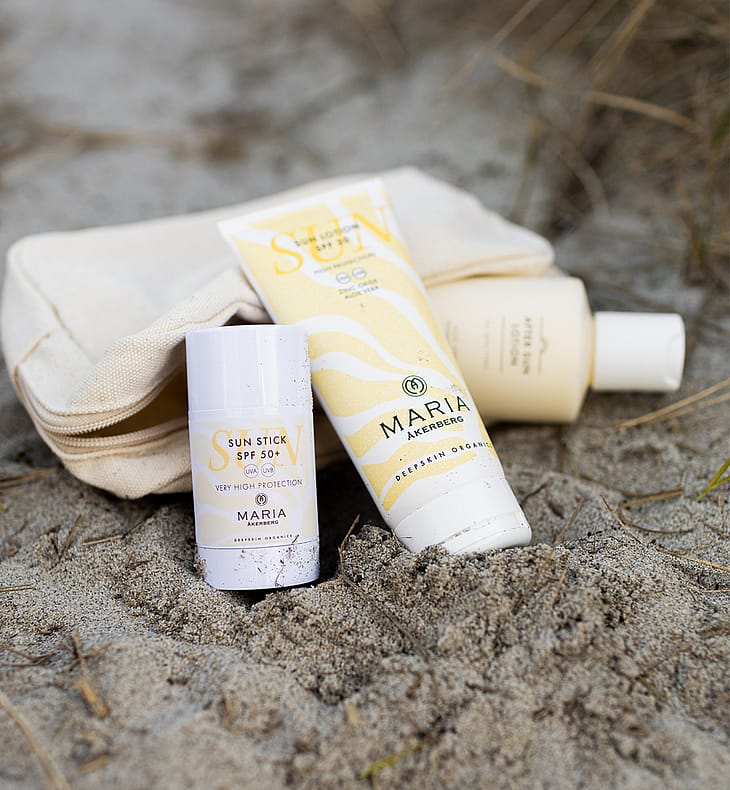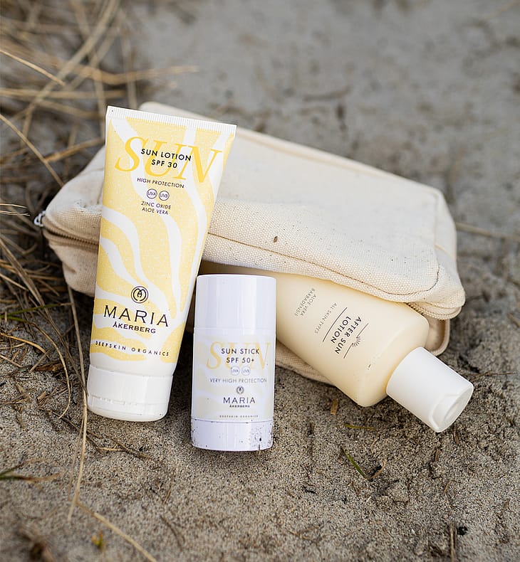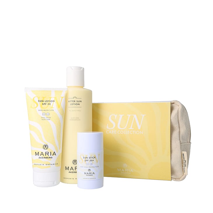Sun Care Collection er et komplett sett med solpleieprodukter for både ansikt og kropp. Den inneholder to fysiske solkremer og beroligende etterpleie. Produktene passer for hele familien og gir effektiv beskyttelse mot både UVA- og UVB-stråler, samtidig som de pleier og restituerer huden etter soleksponering. Et must på solferien og perfekt som en fin gave! Verdi: 926 SEK. Produkter inkludert: Sun Lotion SPF 30, 100 ml: En vannfast solkrem for hele familien og alle hudtyper, som gir høy beskyttelse mot UVA- og UVB-stråler takket være ikke-nano sinkoksid. Den er beriket med mykgjørende jojobaolje og beroligende aloe vera, og har en lett, silkemyk formel og frisk duft av sitrongress. Sun Stick SPF 50+, 30 ml: En praktisk solstift for hele familien, som gir svært høy beskyttelse mot UVA- og UVB-stråler takket være ikke-nano sinkoksid. Den vannbestandige formelen og det fleksible formatet gjør den perfekt til å beskytte følsomme hudområder som lepper, nese og kinn. After Sun Lotion, 250 ml: En fuktighetsgivende bodylotion med en kjølende formel, beriket med beroligende Aloe Vera og antioksidantrik tindvedolje. Den hjelper huden din med å restituere seg etter en dag med soleksponering og saltvannsbad. 100 % mineralbaserte solkremer - for ditt og naturens beste. Alle MARIA ÅKERBERGs solkremer er helt naturlige, fri for kjemiske solfiltre, nanopartikler og mikroplast. De gir øyeblikkelig beskyttelse, er milde nok for ekstra sensitiv hud og trygge for barn. De er Reef Safe og påvirker ikke hav, innsjøer eller korallrev negativt.