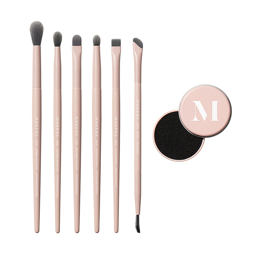 HVERDAGSBLANDINGER. PRESISE EFFEKTER. Påfør, blend og bygg med Morphe Eye Shaping Essentials Bamboo- & Charcoal-Infused Eye Brush Set. Dette settet med seks børster er designet for å tilby maksimal selvuttrykk med minimal innsats. Hver børste er laget med bambus- og kull-infunderte børster som er kjent for sine antibakterielle fordeler; teknikkforbedrende børstehodetettheter og former; og ergonomiske trehåndtak. Inkluderer også en Mini Quick Switch Dry Brush Cleaner for raske fargebytter – ingen vann eller såpe nødvendig.