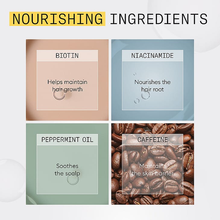 Treatment: Aqua/Water/Eau, Niacinamide, Caffeine, Phenoxyethanol, Sodium Benzoate, Benzyl Alcohol, Acrylates/C10-30 Alkyl Acrylate Crosspolymer, Polysorbate 80, Polysorbate 60, Acetamide MEA, Triethanolamine, PEG-23M, Propylene Glycol, Tetrasodium EDTA, Methyl Nicotinate, Parfum/Fragrance, Mentha Arvensis Leaf Oil, Mentha Piperita (Peppermint) Oil, PEG-30 Dipolyhydroxystearate, Trideceth-6, Limonene, Camellia Sinensis Leaf Extract, Silica, Cystine Bis-PG-Propyl Silanetriol, Biotin, Lecithin, Tocopheryl Acetate, Humulus Lupulus (Hops) Flower Extract, Citrus Paradisi (Grapefruit) Peel Extract, Urtica Dioica (Nettle) Leaf Extract, Acer Saccharum (Sugar Maple) Extract, Citrus Limon (Lemon) Peel Extract, Saccharum Officinarum/Sugar Cane Extract/Extrait de canne a sucre, Vaccinium Myrtillus Leaf Extract, Faex Extract/Yeast Extract/Extrait de levure, Propylparaben, Citrus Aurantium Dulcis (Orange) Fruit Extract, BHT, Potassium Sorbate, Maltodextrin, Methylparaben, Ethylparaben, Butylparaben.