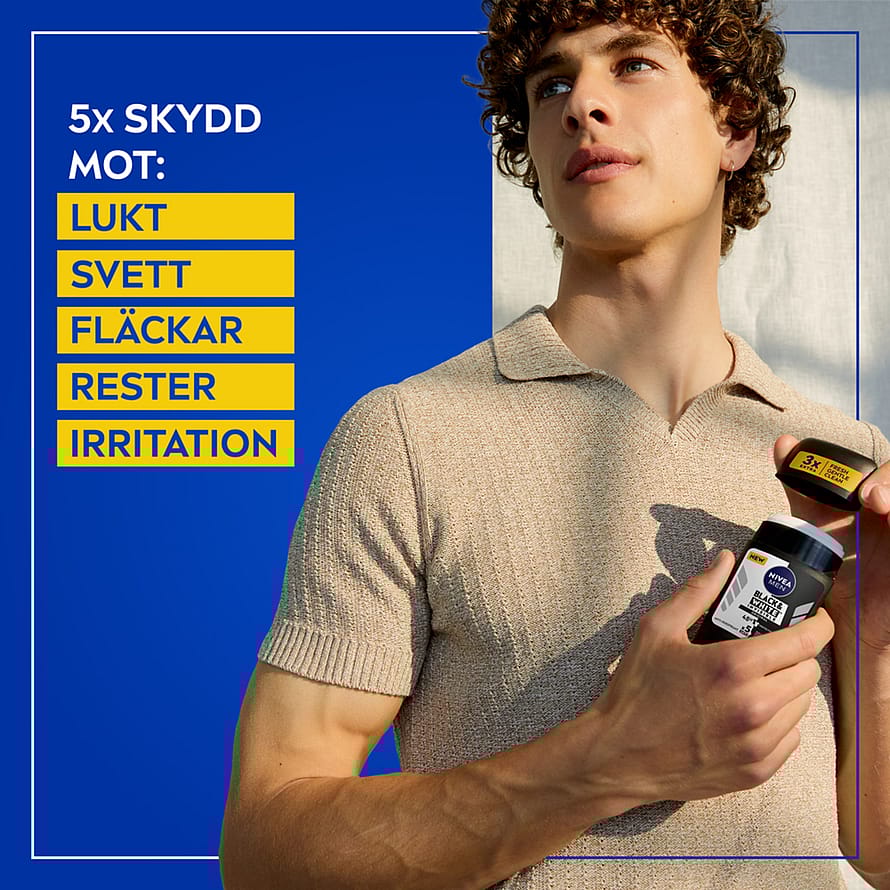 Med sin nye, patenterte emulsjonsteknologi tilbyr NIVEA MEN Black & White Invisible Stick 48 timers pålitelig beskyttelse og smidig påføring. Opplev en deodorant som gir huden en ekstra fresh og ikke-klebrig følelse – passer alle hudtyper. Den dermatologisk dokumenterte og etylalkoholfrie formelen er skånsom mot huden. NIVEA MEN deodorant beskytter mot hvite flekker på sorte klær og gule flekker på hvite klær. Oppdag den nye og moderne designen som er utviklet for en mer intuitiv brukeropplevelse. Den har 25 % mer produktinnhold og 17 % mindre plast per ml (sammenlignet med den tidligere NIVEA Deo-emballasjen).