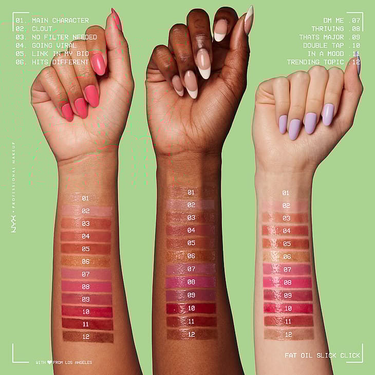 En myk leppepomade med diskret farge for 12 timers fukt og pleie. Myke lepper med bare 1 klikk. NYX Professional Makeup Fat Oil Slick Click er en pigmentert leppepomade som med bare et klikk gir akkurat passe mengde til leppene. Få et pleiende boost med den veganske formelen* som er beriket med avokado-, multe- og bringebærolje.