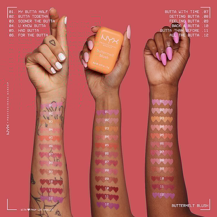 Buttermelt Blush fra NYX Professional Makeup er full av vakre pigmenter som er enkle å tone ut og som holder lenge. Den kremede formelen er full av vakre pigmenter som er enkle å tone ut. Beriket med mango-, mandel- og sheasmør - går alt som smurt. Brukes sammen med Buttermelt Blush Brush for perfekt påføring.