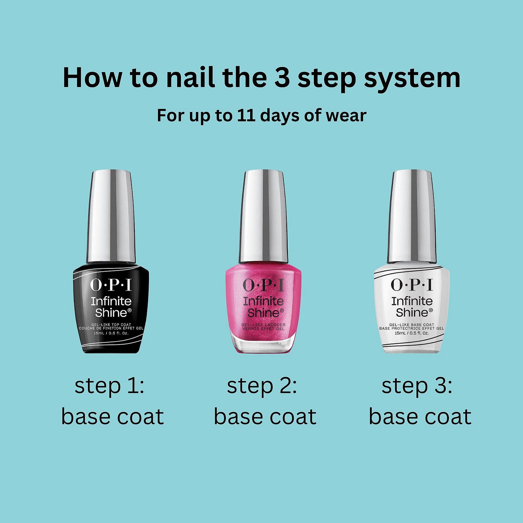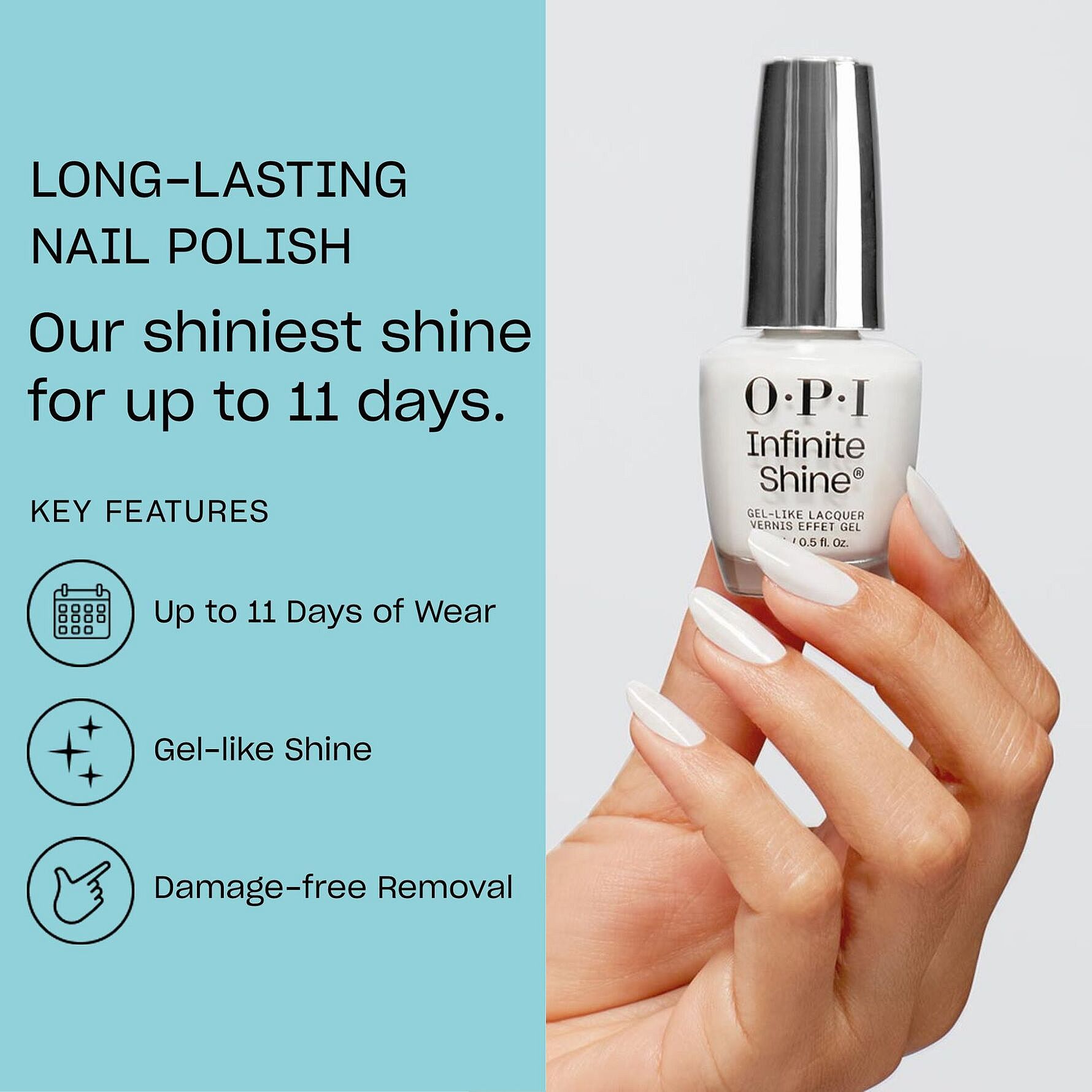 OPIs Infinite Shine er en 3-trinns holdbar neglelakkserie som gir gelaktig glans og har 11 dagers varighet. Brukes med Infinite Shine Primer og Infinite Shine Gloss for lengre holdbarhet.