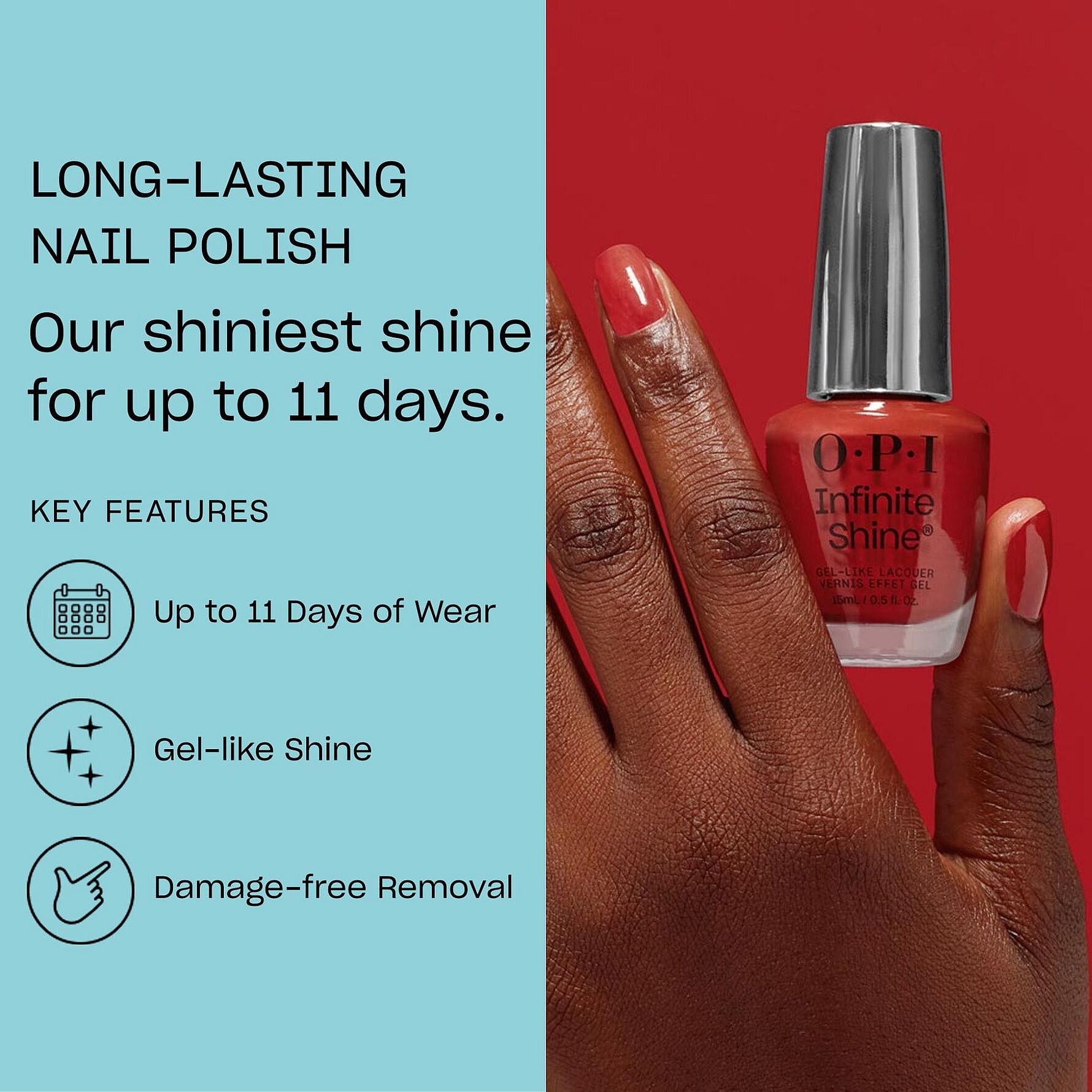 OPIs Infinite Shine er en 3-trinns holdbar neglelakkserie som gir gelaktig glans og har 11 dagers varighet. Brukes med Infinite Shine Primer og Infinite Shine Gloss for lengre holdbarhet.