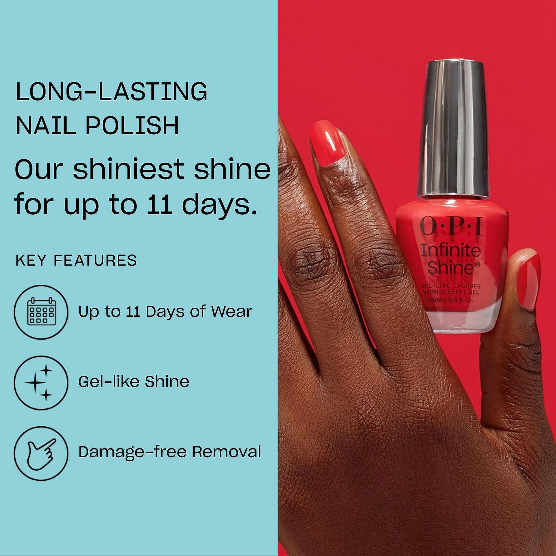 Locks like gel, unlocks like lacquer. OPI introduserer Infinite Shines nye banebrytende formel med en forhåndsherdet gelteknologi som gir glans, dekning og langvarig holdbarhet i opptil 11 dager. Den gellignende formelen omslutter neglene for en glatt og jevn dekning uten striper eller bobler, og fjernes enkelt med aceton for rask og skadefri fjerning. Den er så bra at man tror at det er gel. Infinite Shine er alt du elsker med gel og alt du elsker med lakk.