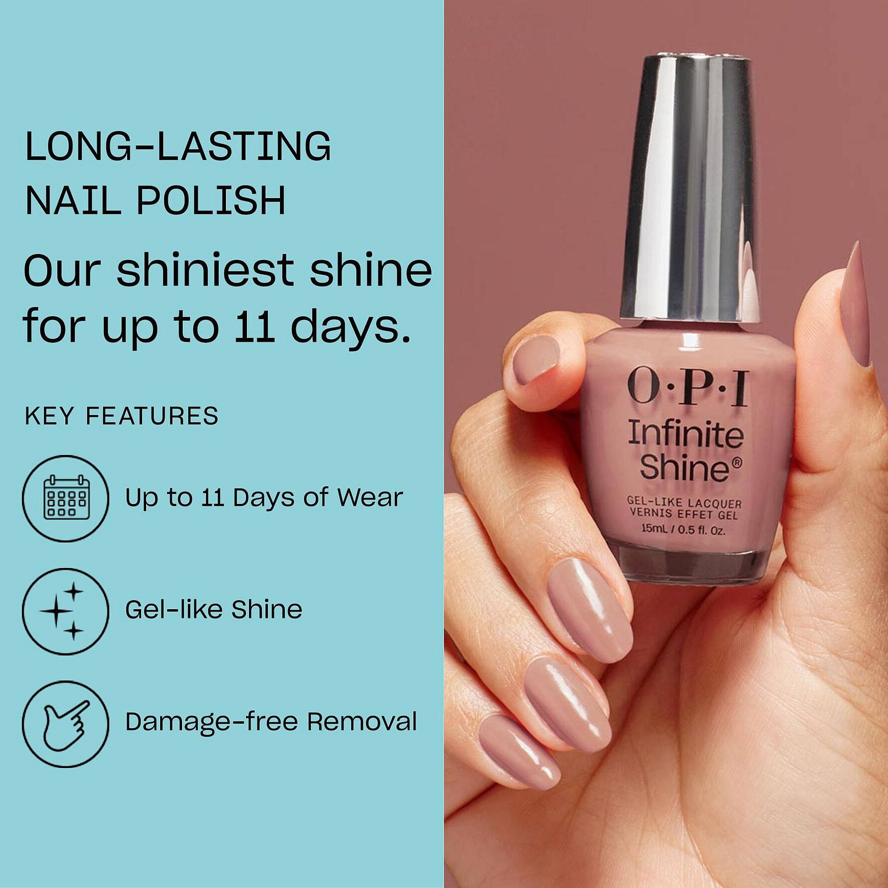 Locks like gel, unlocks like lacquer. OPI introduserer Infinite Shines nye banebrytende formel med en forhåndsherdet gelteknologi som gir glans, dekning og langvarig holdbarhet i opptil 11 dager. Den gellignende formelen omslutter neglene for en glatt og jevn dekning uten striper eller bobler, og fjernes enkelt med aceton for rask og skadefri fjerning. Den er så bra at man tror at det er gel. Infinite Shine er alt du elsker med gel og alt du elsker med lakk.