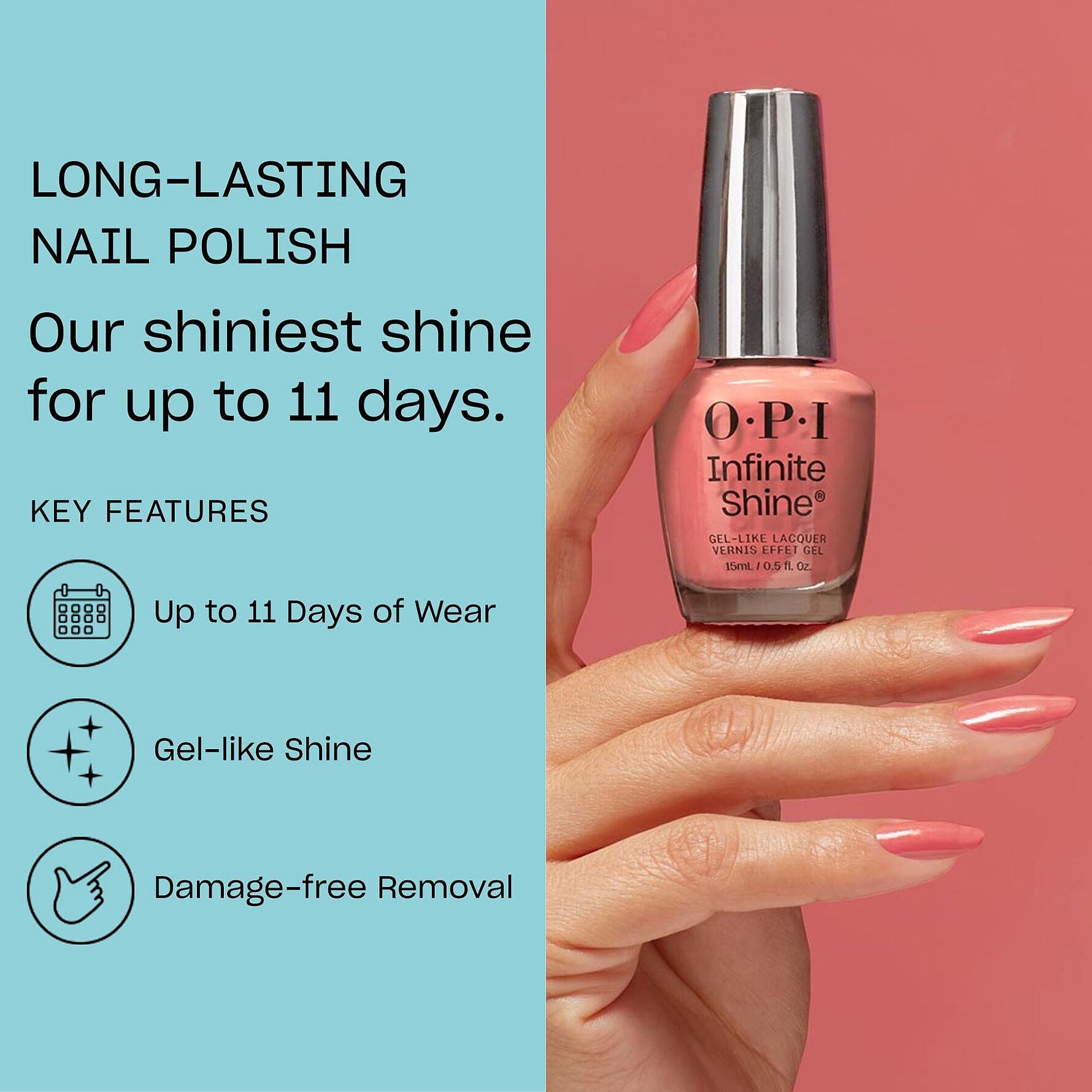 Locks like gel, unlocks like lacquer. OPI introduserer Infinite Shines nye banebrytende formel med en forhåndsherdet gelteknologi som gir glans, dekning og langvarig holdbarhet i opptil 11 dager. Den gellignende formelen omslutter neglene for en glatt og jevn dekning uten striper eller bobler, og fjernes enkelt med aceton for rask og skadefri fjerning. Den er så bra at man tror at det er gel. Infinite Shine er alt du elsker med gel og alt du elsker med lakk.
