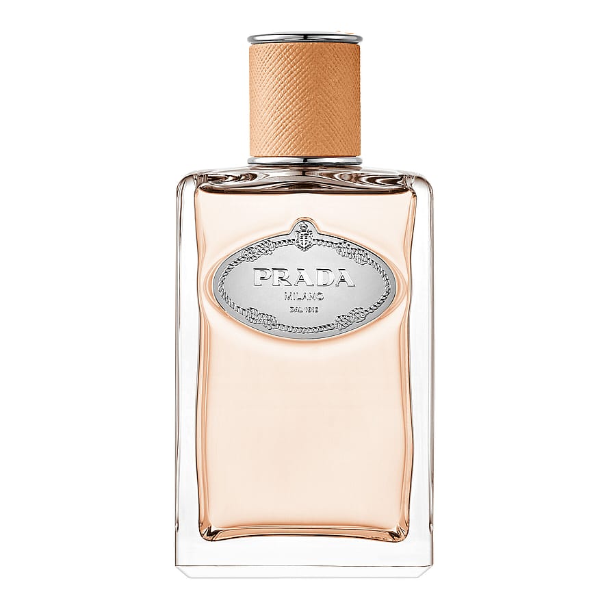 IKONISK DESIGN: tappet i en brunfarget flaske med en kamelfarget Saffiano-teksturert kork, som legemliggjør Pradas tidløse sofistikasjon.