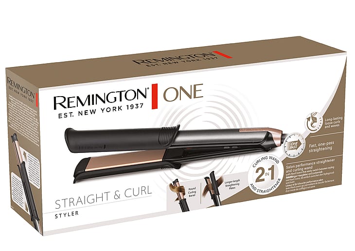 Remington ONE Straight & Curl Styler - det ultimate stylingverktøyet for en rekke forskjellige stiler. Med sitt 2-i-1 design kan du lage vakkert rett hår eller vakre krøller. Bytt sømløst mellom rettetang- og krølltangmodus og utforsk forskjellige stiler med letthet. Den digitale temperaturkontrollen gir deg muligheten til å tilpasse varmen etter ditt ønske. Velg mellom 150-230°C i rettetangmodus og 150-210°C i krølltangmodus. Rettetangen har en avansert antistatisk keramisk belegg som gir en jevnere overflate og som reduserer friksjonen mellom platene og håret ditt. Dette resulterer i en smidig stylingopplevelse, samtidig som det gir håret ditt ekstra glans og reduserer risikoen for frizz. Krølltangen har en 32mm keramisk sylinder for å lage langvarige krøller og bølger, og med teksturert overflate som holder håret på plass, men inkluderer også en stylinghanske som beskytter hendene dine mot varmen. Ved bruk av krølltangen, trekk tilbake det skyvbare dekselet mot ledningsfestet til du hører et lite klikk. Den samme prosessen gjelder ved bruk av rettetangmodus, men skinnene skal da trekkes mot motsatt hold. For å sikre hvilken innstilling som er aktivert, kan man se på displayet om det står