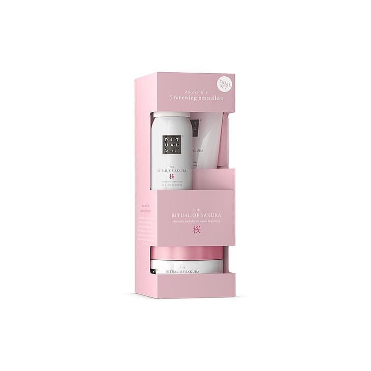 Settet fra The Ritual of Sakura er den perfekte introduksjonen til Rituals og er en ideell gave til noen du er glad i eller til deg selv. Det kombinerer tre av kolleksjonens bestselgere: Et dusjskum, en kroppskrem og en sukkerskrubb til kroppen. Alle er beriket med den fornyende duften av kirsebærblomst og nærende rismelkekstrakt.