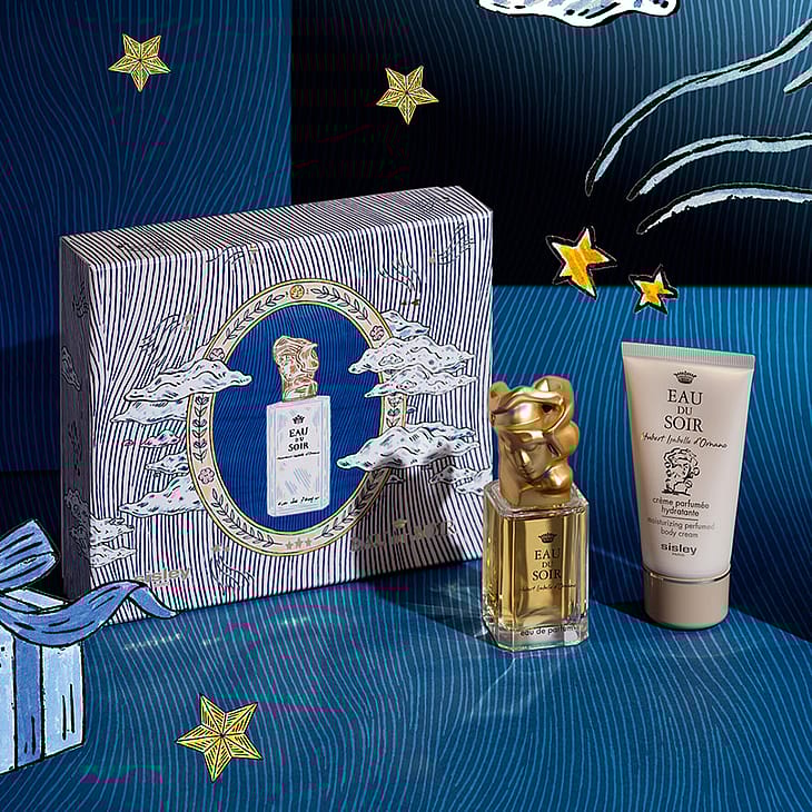 Det nyeste Eau du Soir-gavesettet i begrenset opplag er dekorert med illustrasjoner av den britiske kunstneren Fee Greening. Hennes blinkende stjerner og hvite skyer bringer tankene hen på en rusletur gjennom Alcazar-hagene i Sevilla i skumringen. Dette er en hyllest til Sisleys ikoniske eau de parfum, som kombinerer friskheten fra sitrus med sensualiteten fra blomster og skaper en elegant chypré-signatur.