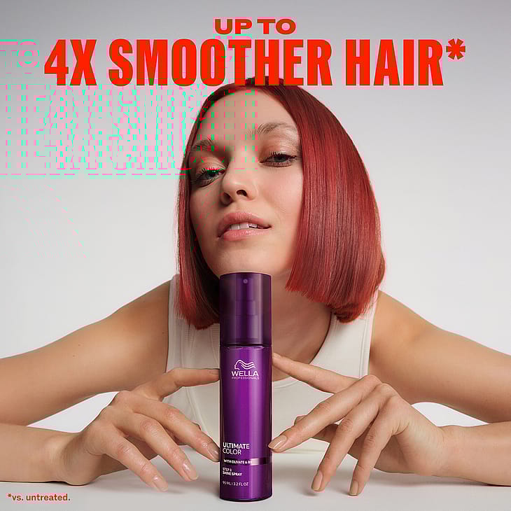 Wella Professionals Ultimate Color Shine Spray er en lett glansspray som gir farget hår en glatt og skinnende finish. Sprayen tilfører umiddelbar glans og gjør håret opptil 4x glattere*, uten å tynge det ned. Formelen inneholder olivate for mykhet og Pro-Vitamin B5 som kapsler inn fukt, og gir et silkeaktig og lettstylet resultat.
