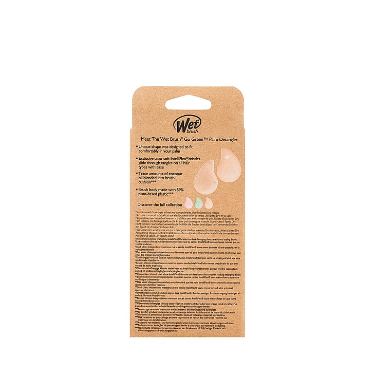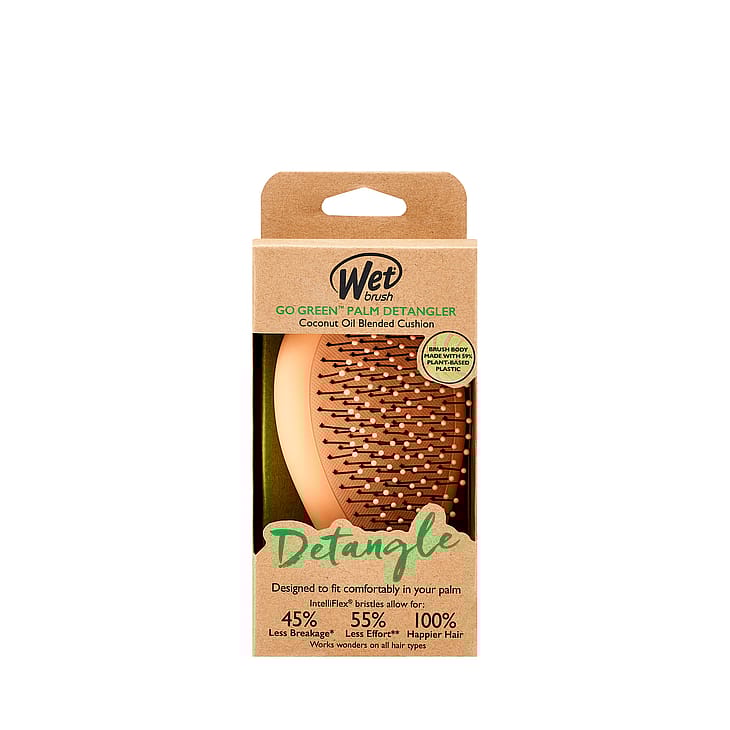 Go Green Detangling Palm Detangler er en børste som smertefritt grer ut knuter i håret. Børsten er designet så den er behagelig å holde i. Børsten har myk og svært fleksibel IntelliFlex®-bust som gjør at den glir lett gjennom håret og fjerner alle «rykk» som gir slitasje og øm hodebunn. De myke kulene ytterst masserer hodebunnen forsiktig og stimulerer blodsirkulasjonen. Håndtaket og børstehodet er laget av 59% plantebasert plast. Til bruk i både vått og tørt hår. Passer til alle hårtyper. Må ikke brukes ved føntørking.