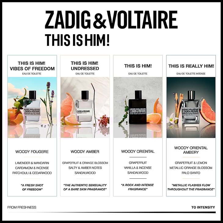 This is him! Undressed fra Zadig & Voltaire er en forførerisk og vegansk eau de parfum for ham. De kraftfulle, krydrete duftnotene av sedertre skaper en maskulin duftsignatur som forsterkes av rav og sandeltre. Delikate noter av saftig grapefrukt gir en eksplosjon av friskhet som er både luksuriøs og sensuell. Inspirasjonen bak duften er intimitet, nærhet og sensuelle minner. Med This is Him! Undressed lanserer Zadig & Voltaire en intim, sensuell, personlig og beroligende duft som oppmuntrer deg til å gjenopprette kontakten med deg selv, samtidig som du tør å la andre komme nær. Denne maskuline duften passer for den ubevisst karismatiske og utad elegante mannen, som innerst inne er lidenskapelig og selvstendig. Som lever livet fullt ut.